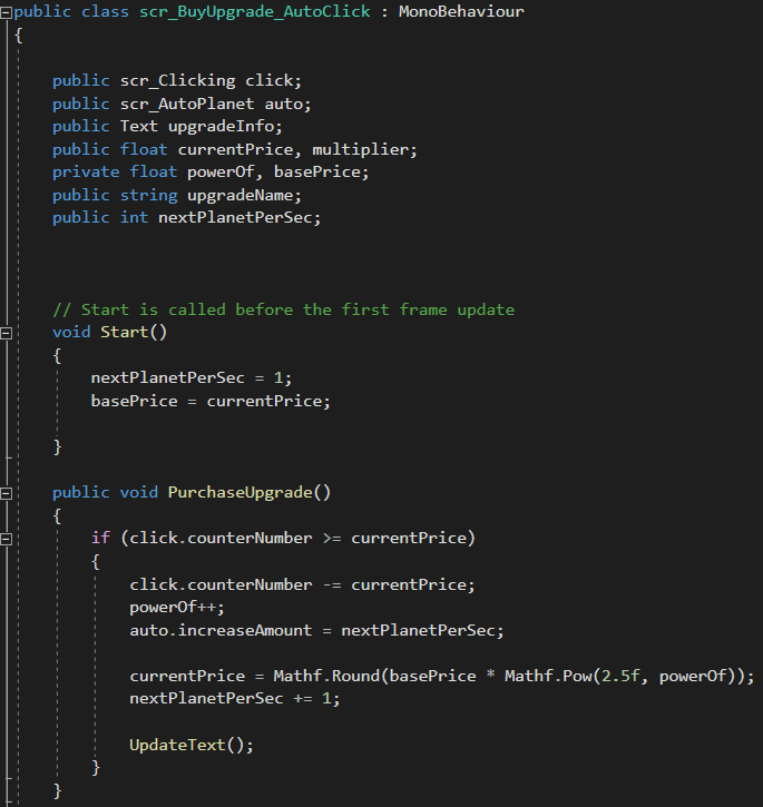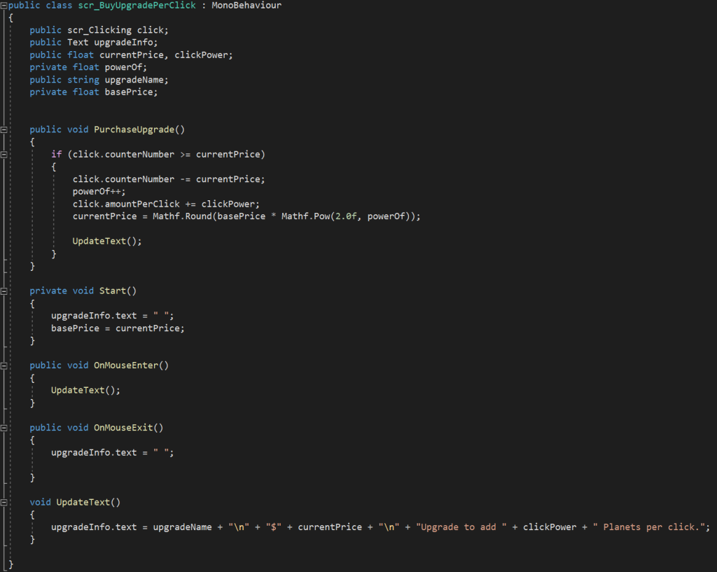 So to start with the game engine would check to see if the number of planets was greater than the purchase cost and if so then that item could be available for the player. However, making the cost the same as the game progresses wouldn’t make it much of a challenge so that’s were I input the ‘Mathf.Pow(2.0f, powerOf);’ so it increases the price every purchase therefor making it more of a challenge and more rewarding to purchase each time!