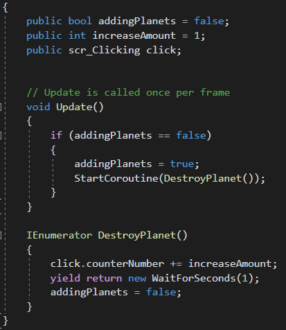 To begin with I referenced another script I was using within Unity making both scripts understand each other. After that this script becomes about auto generating the planets after they have been destroyed by using such functions as ‘coroutine’ and ‘IEnumerator’ which is allowing Unity to create another planet once the one clicked on had been destroyed.