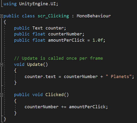 So now within the script I needed to place a number of variables which can either be public or private(accessed in Unity or not). I began with referencing the Text element which would be the counter. Next I created a public float for the ‘counterNumber’ which tells me that this will be a number that can have a decimal point (eg. 4.3). Lastly in the variables I added the final variable which was another public float ad this one was ‘amountPerClick’ which I set to a value of 1.0 but with it being public it was a value I could change within Unity if I wanted to.