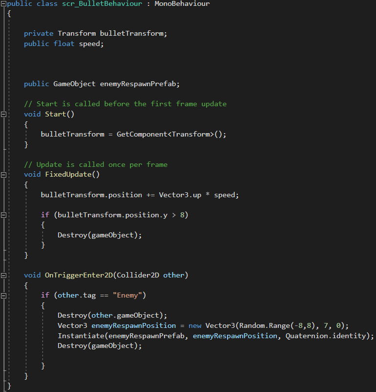 To start the scripting I used a function called ‘void OnTriggerEnter(Collider2D other)’. Within this function I can use another ‘if’ statement to detect whether or not the bullet prefab has come into contact with the object tagged ‘Enemy’. If this statement occurs then the following script will begin to run which starts off by destroying the game object. Next I can set a position I would like the enemies to respawn at by saying the ‘enemyRespawnPosition = new Vector3(Random.Range(…’ and then finding suitable boundaries within the horizontal axis in Unity to input in order to make the enemies spawn within that range. Lastly is to spawn the enemies using the ‘Instantiate’ function as well as ‘Quaternion.identity’ which means it corresponds to no rotation upon spawning.