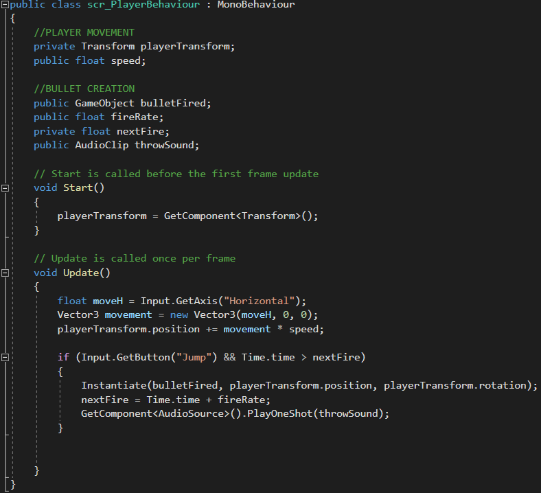For the player behaviour script it can mainly be broken down into three sections; Player movement, Bullet creation & Audio. For the player movement we wanted to be able to access the Transform component within Unity by referencing it in the script. Lastly, I needed access to the speed of the player which I also wanted to be able to edit it in Unity so I make this a public float.