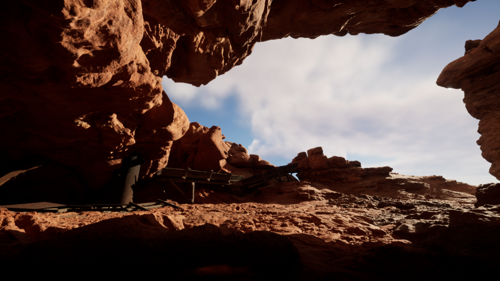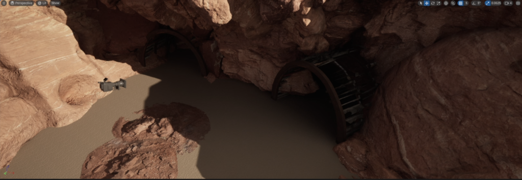 As soon as I knew I wanted to place my environment in a deserted location, I was immediately thinking of how to utilise the natural sunlight for some really nice effects. The orange glow of a distant sunset upon the orange and almost canyon like rocks creates a really nice glow around the scene. Not only that but the directional light in UE5 can make a really nice effect for making such things like my hero asset stand out in the environment it has been placed in.