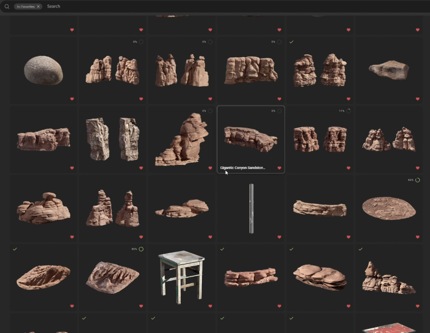 A large amount of time was spent searching through the available assets I could use to create my environment. These are multiple assets I saved to my favourites for future download to use. The orange rocks were perfect for the colour theme I’m going for.