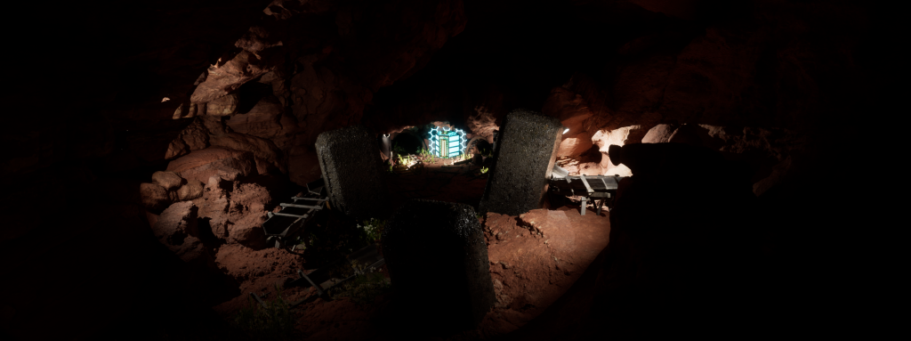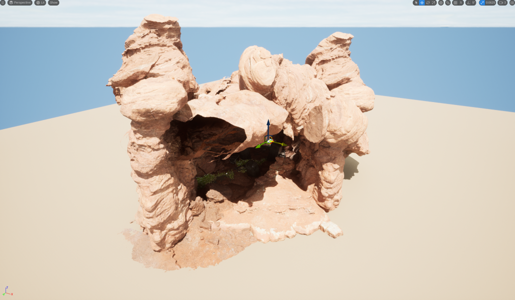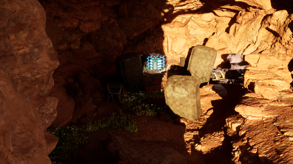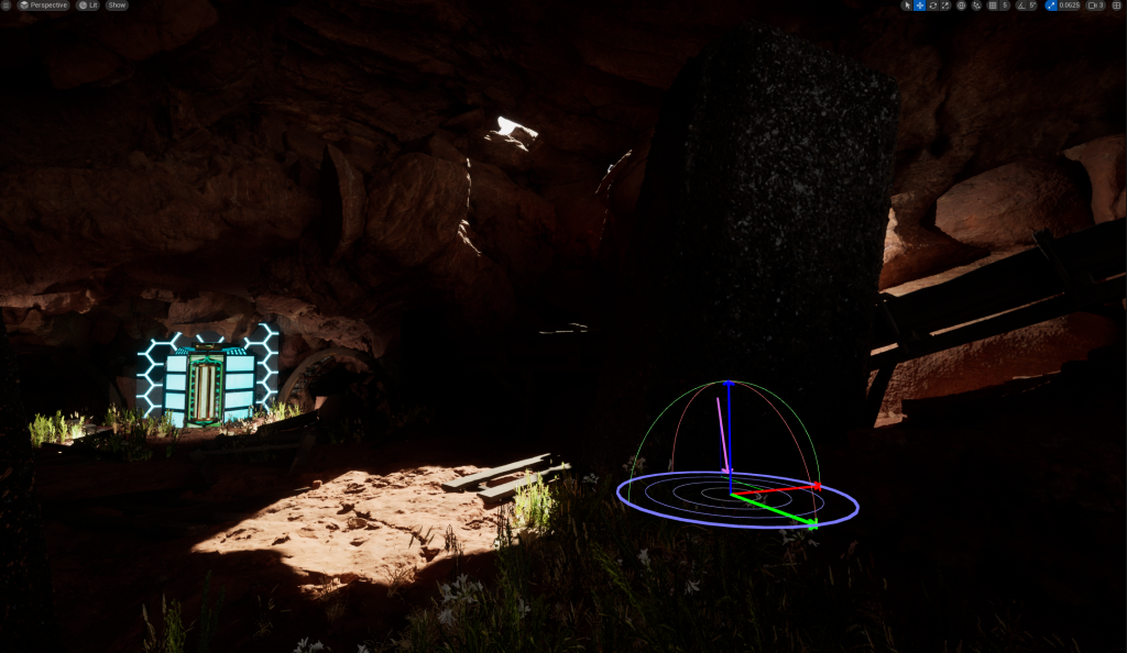 Then I began using what I call, caving-in the environment. I wanted to be able to use actual light sources in my environment and not just rely on the natural light UE provides. By making my entrance into a almost cave light structure, it allowed me to be a bit more adventurous with my lighting inside the scene. This took multiple goes with many different rocks and shapes before I got my desired look to the scene.