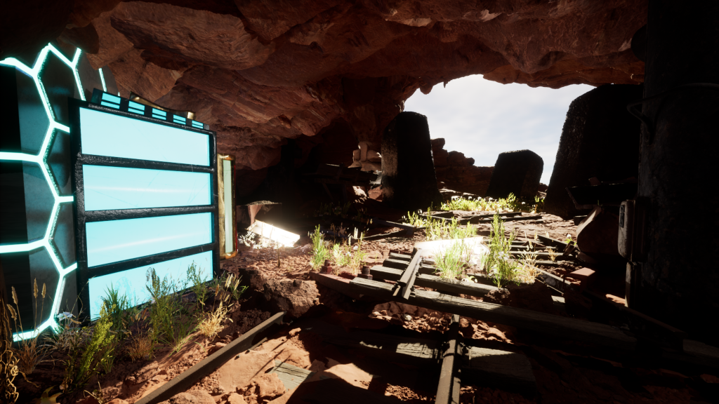 I really love that I was able to create the intense emissive glow I was looking for as that has really helped me incorporate my asset, but also enough to give it the spotlight it deserves when surrounded by such beauty in the natural feel of the environment. The ‘unnatural’ lighting not so visible in this scene, as the sun gazes into the cave the immense glow from the power source still overtakes and controls all the light surrounding it, giving it a very powerful feel to the asset.