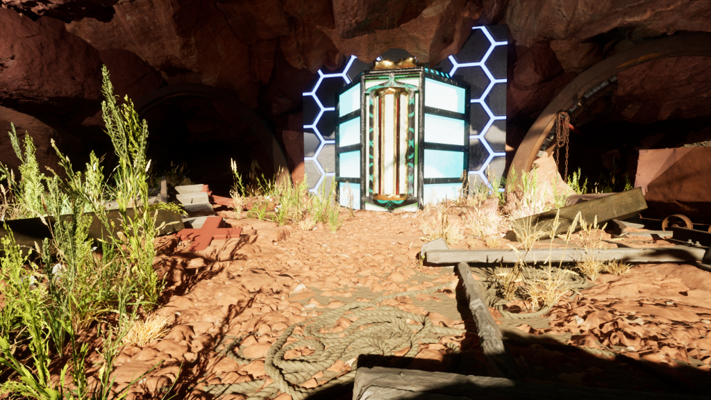 ‘Deep within the desert lies the Deserted Mountains, once known by the ancient civilizations as a mountain of treasure and immense power. The riches and minerals sourced were being utilised and recycled into an uncontrollable amount of energy. What we have stumbled upon the entrance seems to be a huge power source still gaining power from within. What happened here for there to be no one here anymore? Or are there still others? The tunnels seem to be the way in.’